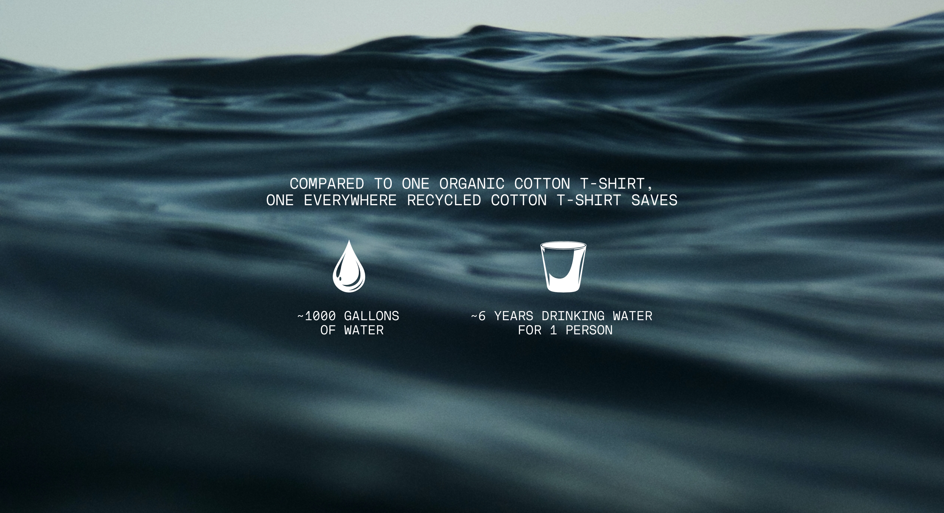 Beyond fiber cultivation, additional water is often needed for finishing processes, such as bleaching and dyeing to produce organic cotton apparel. Everywhere’s 100% recycled cotton apparel saves water by skipping bleach, and our basic color lines do not require dyes because we source textile scraps by color. When comparing one Everywhere recycled cotton t-shirt with one organic t-shirt, our product saves ~1,000 gallons of water, which is equivalent to ~6 years of drinking water for one person (5).