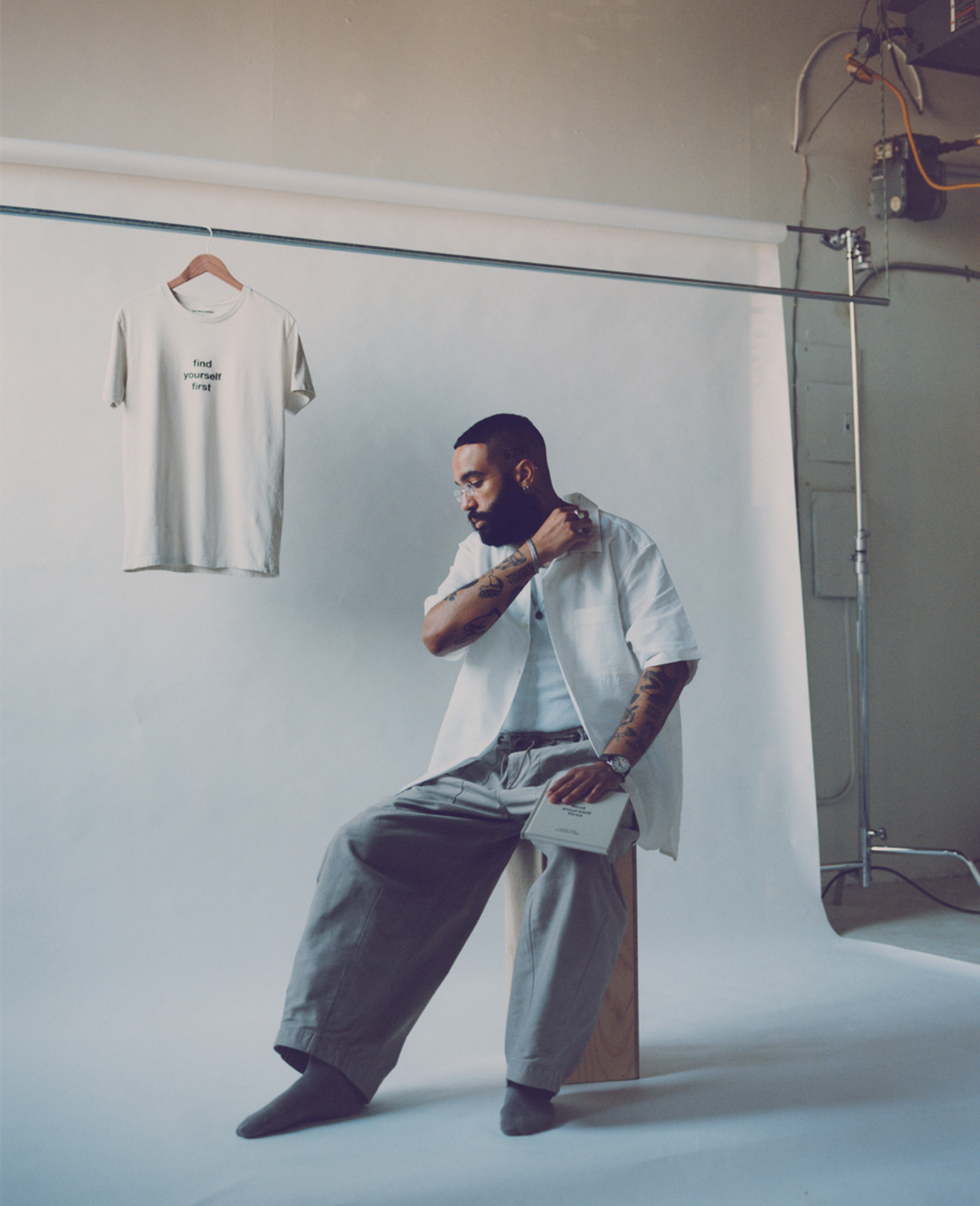 We provided custom earth tone dyed and printed recycled apparel for multidisciplinary creative Santana Bellas for the launch of his photobook “find yourself first”.